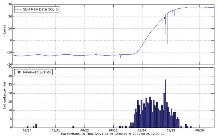 There were 2 events with 3 or more felt reports in the Hawaiian Islands during the past week: a M2.8 earthquake 21 km (13 mi) WNW of Mountain View at 19 km (12 mi) depth on Aug. 25 at 9:25 a.m. HST and a M3.3 earthquake 9 km (5 mi) ENE of Pahala at 32 km (19 mi) depth on Aug. 20 at 10:16 a.m. HST.