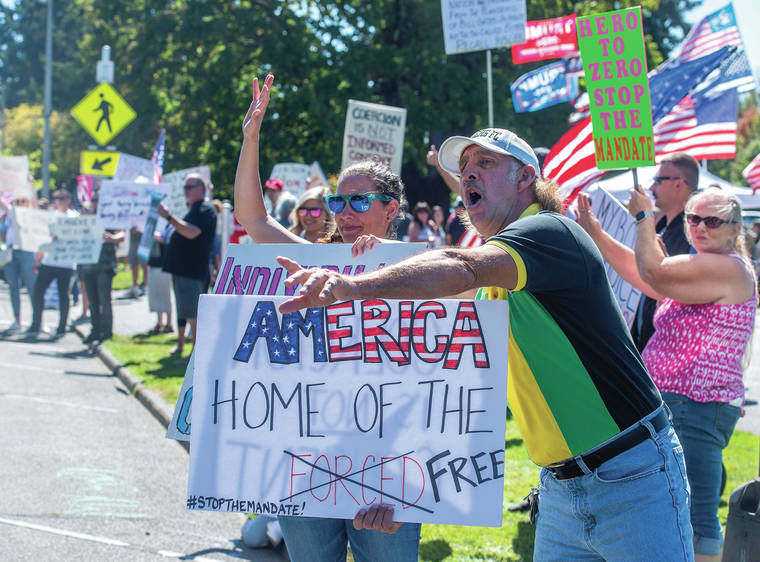 People gather outside the Capitol to protest Gov. Jay Inslee's vaccine mandate for state workers Saturday in Olympia, Wash. (Drew Perine/The News Tribune via AP)