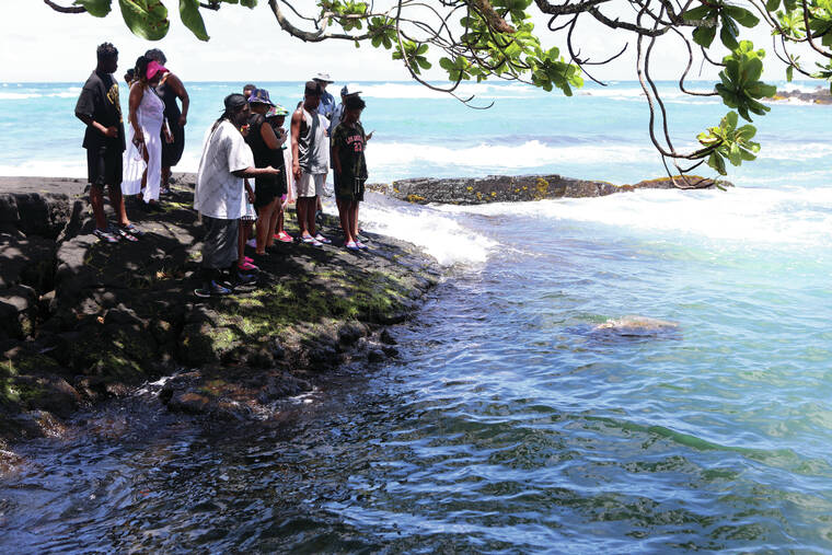 Kelsey Walling/Tribune-Herald A family watches as a sea turtle swims by at Carlsmith Beach Park in Keaukaha on Friday.