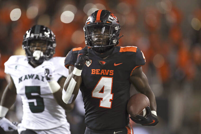 Hawaii linebacker Darius Muasau was called for targeting tackling Nolan on an 11-yard run, and that penalty helped ignite a drive that culminated with a 13-yard touchdown pass to Anthony Gould on the first play of the fourth quarter, giving the Beavers a 38-20 lead.