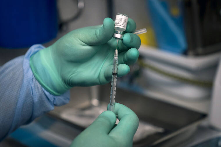 FILE - In this Aug. 26, 2021 file photo, Parsia Jahanbani prepares a syringe with the Pfizer COVID-19 vaccine in a mobile vaccine clinic operated by Families Together of Orange County in Santa Ana, Calif. An international group of scientists is arguing the average person doesn’t need a COVID-19 booster yet — an opinion that highlights the intense scientific divide over the question. (AP Photo/Jae C. Hong, File)