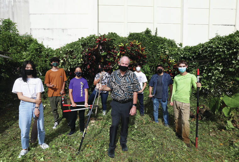 Kelsey Walling/Tribune-Herald From left, Sakura Yabuki, Aiki Bothell, Gabriella Tuson, RyAnne Raffipiy, Larry Reitzer and Sam Hall pose for a photo ojn Sept. 10 with Mayor Mitch Roth, center, before weeding grass at the location for a mobile theater stage outside East Hawaii Cultural Center.