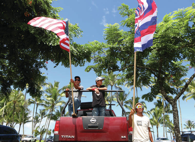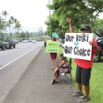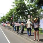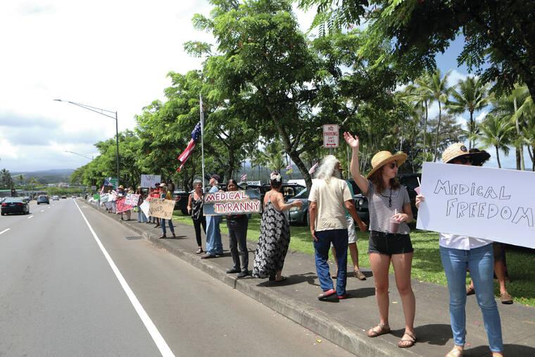 About 250 people lined the sidewalks Saturday on Kamehameha Avenue to express dissent and opposition to vaccine and mask mandates set by the state and county government.