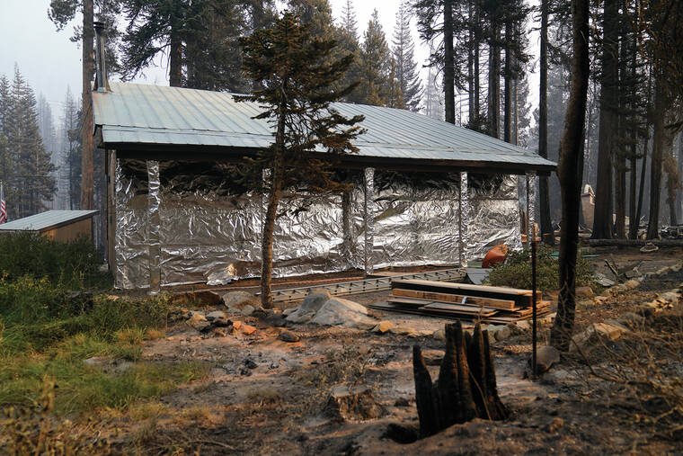 In this Sept. 2 file photo, a cabin partially covered in fire-resistant material stands next to properties destroyed in the Caldor Fire in Twin Bridges, Calif. Aluminum wraps designed to protect homes from flames are getting attention as wildfires burn in California. (AP Photo/Jae C. Hong,File)