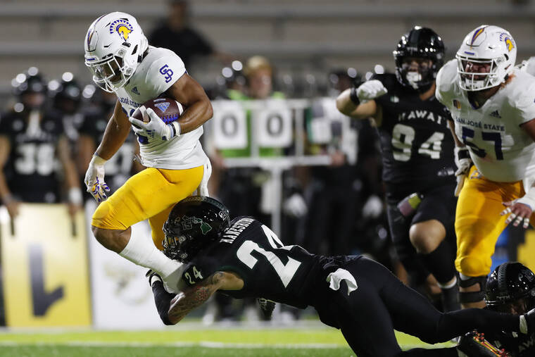 Kairee Robinson blocked a punt to set up a seven-play, 44-yard drive culminating when Starkel hit Isaiah Hamilton for a 13-yard score and, after a Hawaii three-and-out, he connected with Jermaine Braddock 1-yard TD with 2:23 left in the first half to give San Jose State the lead for good at 14-7.