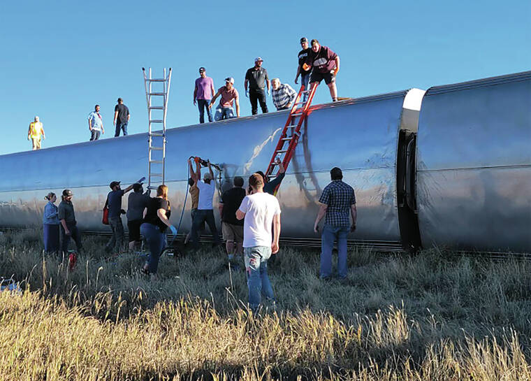 People work at the scene of an Amtrak train derailment on Saturday in north-central Montana. (Kimberly Fossen via AP)