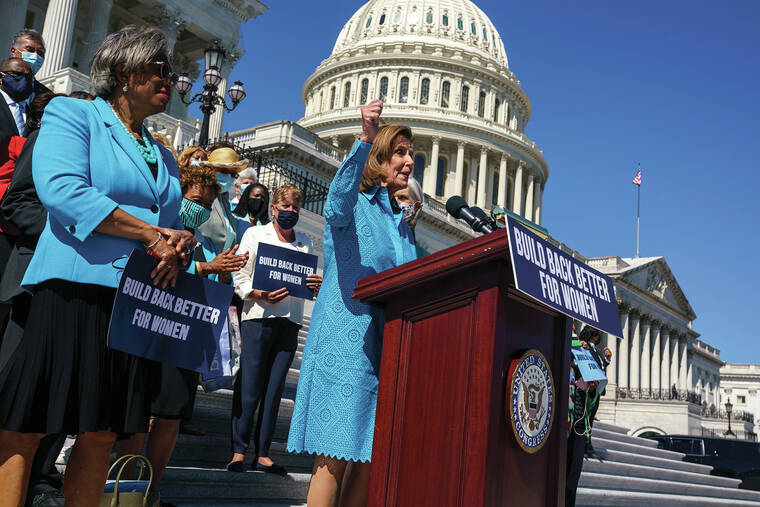 House Speaker Nancy Pelosi, D-Calif., joined at left by Rep. Brenda Lawrence, D-Mich., holds a rally in support of President Joe Biden's "Build Back Better" plan Friday at the Capitol in Washington. (AP Photo/J. Scott Applewhite)