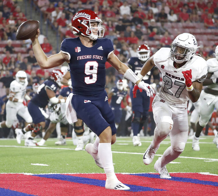 Fresno State quarterback Jake Haener avoids a sack against UNLV linebacker Austin Ajiake during the first half of an NCAA college football game in Fresno, Calif., Friday, Sept. 24, 2021. (AP Photo/Gary Kazanjian)