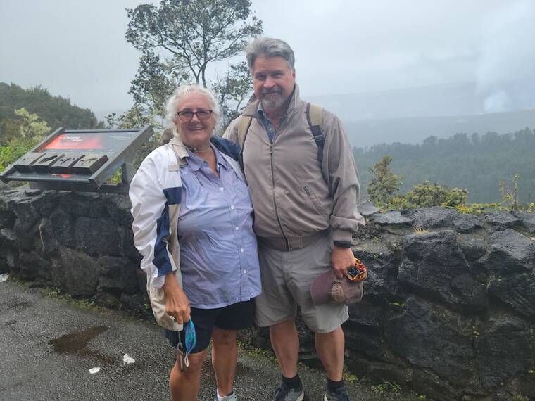 MICHAEL BRESTOVANSKY/Tribune-Herald Rene and Allen Bradford, visiting from Connecticut, braved the rain to try and see the eruption Thursday.
