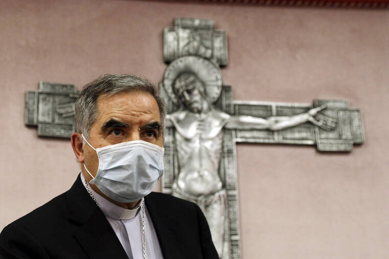 In this 2020 file photo, Cardinal Angelo Becciu talks to journalists during a press conference in Rome. (AP Photo/Gregorio Borgia, File)