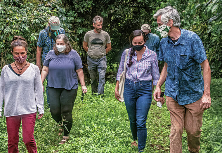 Jason Stith, right, leads sen. Dru Kanuha (D-Kona, Ka’u) and rep. Nicole Lowen (D-North Kona) on a tour of his farm in Honaunau Thursday morning. (Tom Linder/West Hawaii Today)