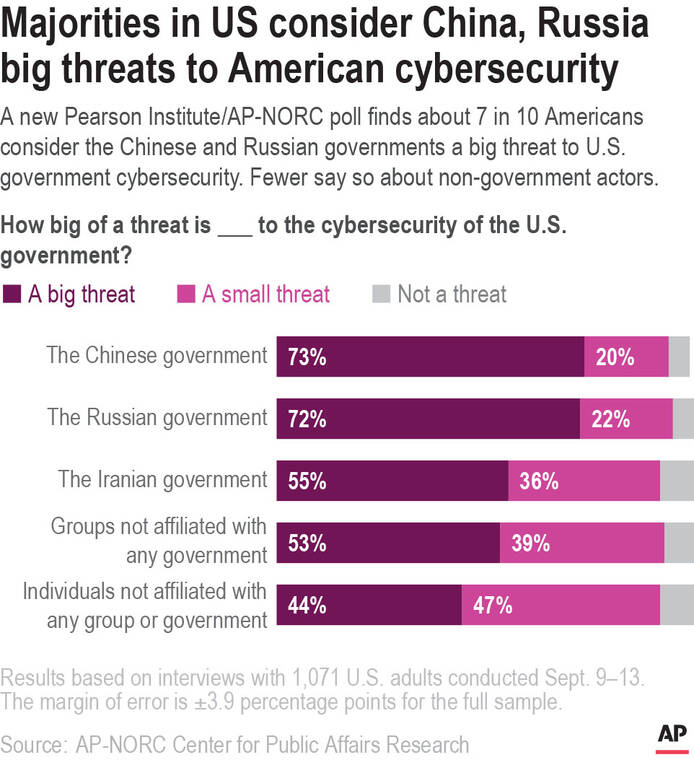 RICHMOND, Va. — Most Americans across party lines have serious concerns about cyberattacks on U.S. computer systems and view China and Russia as major threats, according to a new poll.