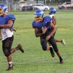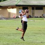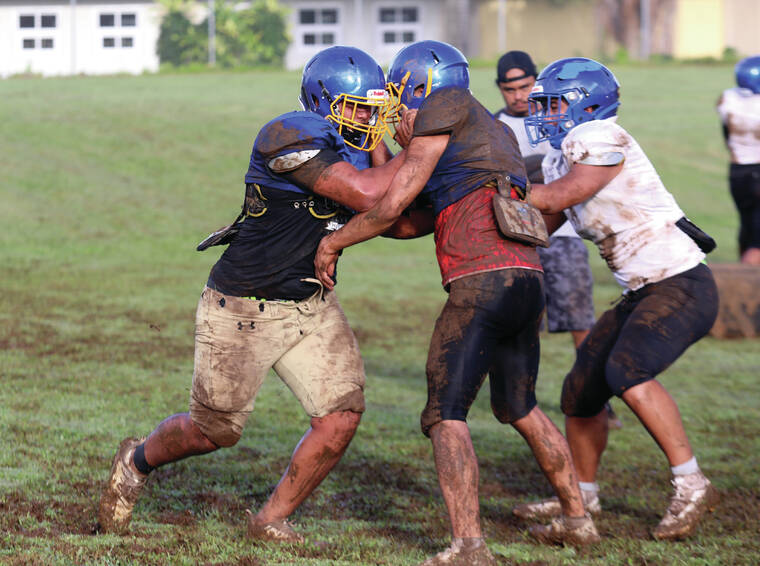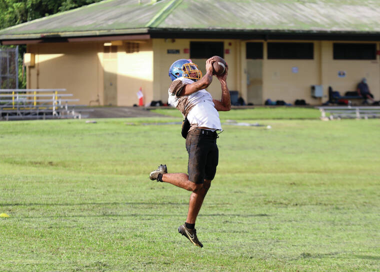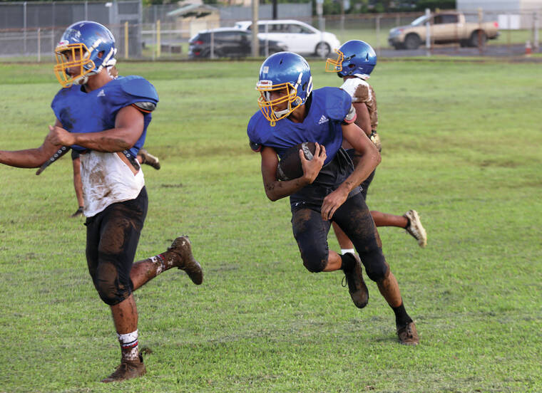 Naoi Richardson, a senior, and Kaunuali’i Harman, a junior will be the wideouts. Harman, who’s a soccer player, is in his first year playing football. Senior Damien Kai and Akui will be the slotbacks.