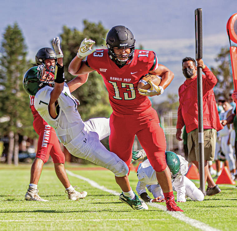 Braeden Samura (13) bowls over Pahoa defender Zedekiah Ahin-Ganir in the first half of HPA’s season opener Saturday. Samura caught one touchdown during HPA’s 69-0 victory over the Daggers. (Tom Linder/West Hawaii Today)