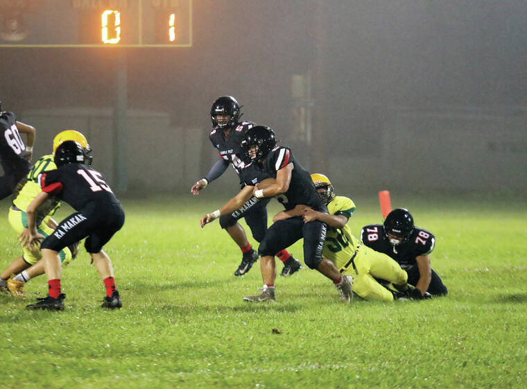 Coach Fred Lau wasn’t making any excuses, but the slippery elements didn’t do any favors for an offense looking to pitch the ball to its backs. The Dragons, who were playing their opener because last week’s game against Kohala was pushed back, fumbled 11 times, losing two of them, and when all the negative plays were accounted for, they totaled just 23 yards. Honokaa’s best play from scrimmage was Micah Acdal’s 20-yard run.