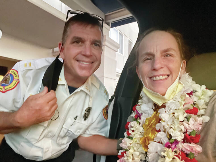 Volunteer firefighter Lizzy Stabo is accomanied back to the Big Island by her volunteer fire Captain Ron Ebert after spending nearly eight weeks in the burn unit at Straub Medical Center. Courtesy photo/Special to West Hawaii Today