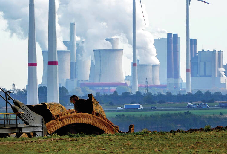 Steam comes out of the chimneys of the coal-fired power station Neurath near the Garzweiler open-cast coal mine Monday in Luetzerath, Germany. (AP Photo/Michael Probst)