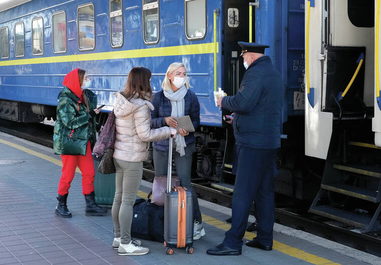 In this Tuesday photo, a train conductor checks the COVID Certificates of passengers, at a train station in Kyiv, Ukraine. (AP Photo/Efrem Lukatsky, File)