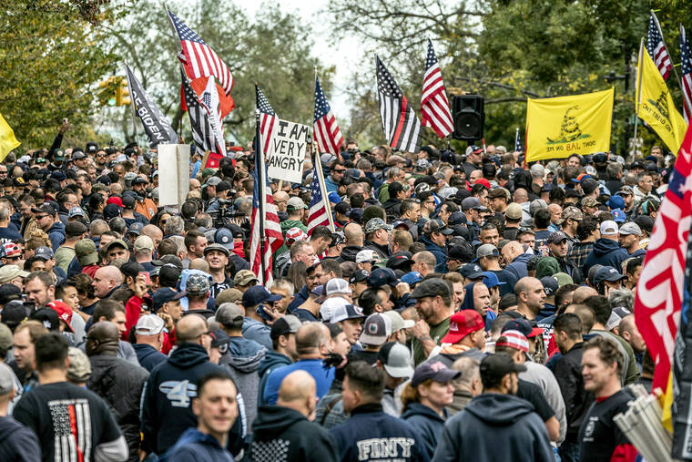 Firefighters rally outside Mayor Bill De Blasio's residence on Oct. 28 to protest COVID-19 vaccine mandates for city workers in New York. The city is bracing for a worker shortage as tens of thousands of municipal employees remain unvaccinated. (AP Photo/Jeenah Moon)
