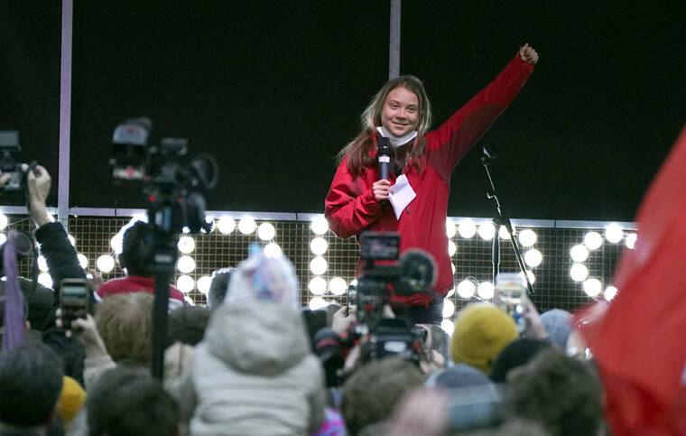 Climate activist Greta Thunberg gestures Friday as she speaks on the main stage at the end of a protest in the center of Glasgow, Scotland, which is the host city of the COP26 U.N. Climate Summit. (Andrew Milligan/PA via AP)