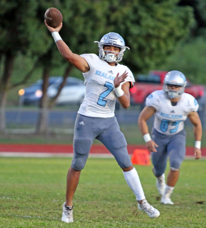 TIM WRIGHT/Tribune-Herald Kealakehe quarterback Sheynen-Wyatt Nahale threw for close to 400 yards and four touchdowns Friday night in a 54-34 win against Keaau.