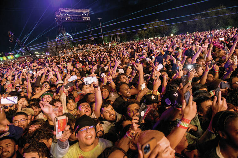 The crowd watches as Travis Scott performs Friday at Astroworld Festival at NRG park in Houston. (Jamaal Ellis/Houston Chronicle via AP)