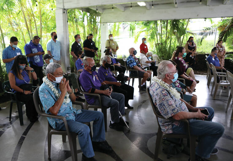 Kelsey Walling/Tribune-Herald County officials, veterans and people involved in the project come together for an event celebrating Hale Nā Koa ‘O Hanakahi, which will be an affordable housing complex in Hilo for veterans and spouses of deceased veterans on Thursday.