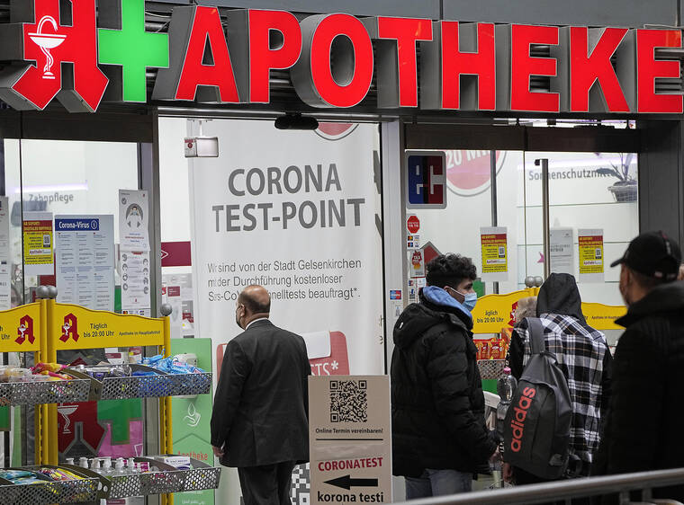 A man walks into a pharmacy that offers coronavirus tests Friday in Gelsenkirchen, Germany. (AP Photo/Martin Meissner)