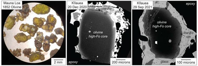 Olivine crystals — the beautiful green mineral common in Hawaiian lavas — record when and where magmas move inside Hawaiian volcanoes before they erupt. We can actually use these little crystals like clocks to better understand the magmatic events leading to the December 2020 and September 2021 summit eruptions at Kilauea.