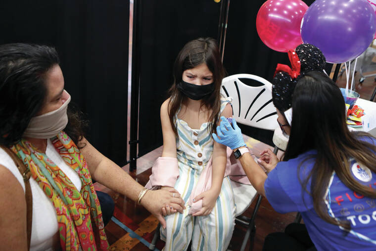 Kelsey Walling/Tribune-Herald Hokulaa Roback, 7, holds her mom's hand while getting vaccinated for COVID-19 in the gym at St. Joseph High School in Hilo on Wednesday. KTA hosted a vaccination clinic catered to keiki 5 to 11.