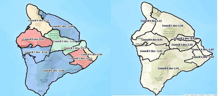 Puna Council District 5, with 2,494 more people than ideal, and North Kona Council District 8, with 2,002 over the ideal, will likely shrink geographically. Kona Council District 7, with 1,814 fewer people than the ideal, and South Kona/Ka‘u Council District 6, with 1,484 fewer than ideal, will likely have to expand their boundaries.