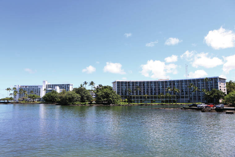 Kelsey Walling/Tribune-Herald The Grand Naniloa Hotel and the Hilo Hawaiian Hotel are seen from Coconut Island in Hilo on Thursday, Oct. 21, 2021.