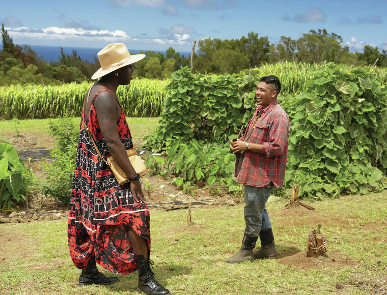 Courtesy photo Lanakila Mangauil, right, meets his “drag mom” Bob at his community farm in Honokaa