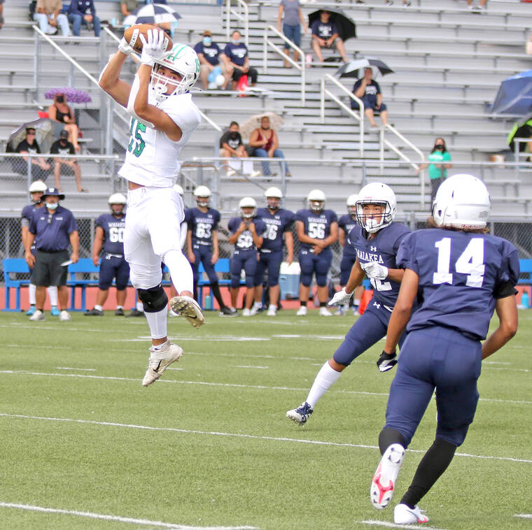 Kona’s Kamaehu Makanui goes up high for a pass during Saturday’s game hosted by Waiakea. Photo: Tim Wright