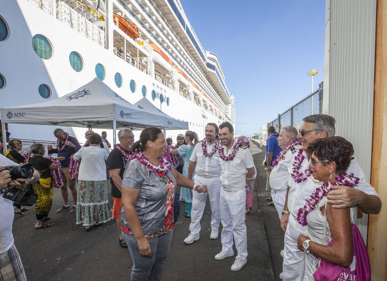 In this 2019 file photo, crew and passengers are given lei by Destination Hilo volunteers as they get off the the cruise ship, MSC Magnifica in Hilo's port. (Tribune-Herald file photo)