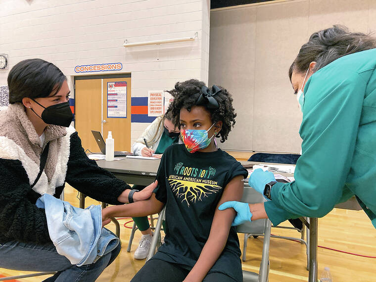 Cadell Walker comforts her daughter Solome, 9, as nurse Cindy Haskins administers a Pfizer COVID-19 shot on Nov. 13 at a vaccination clinic at Ramsey Middle School in Louisville, Ky. (AP Photo/Laura Ungar)