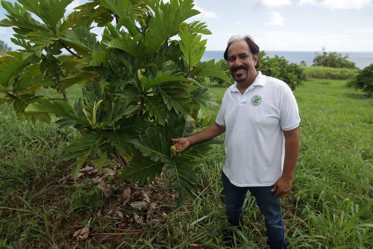 Kamehameha Schools photo Kyla Datta, president of Hawaii ‘Ulu Cooperative and owner of Mana ‘Ulu, an ‘ulu farm in Umauma, stands next to one of his trees.