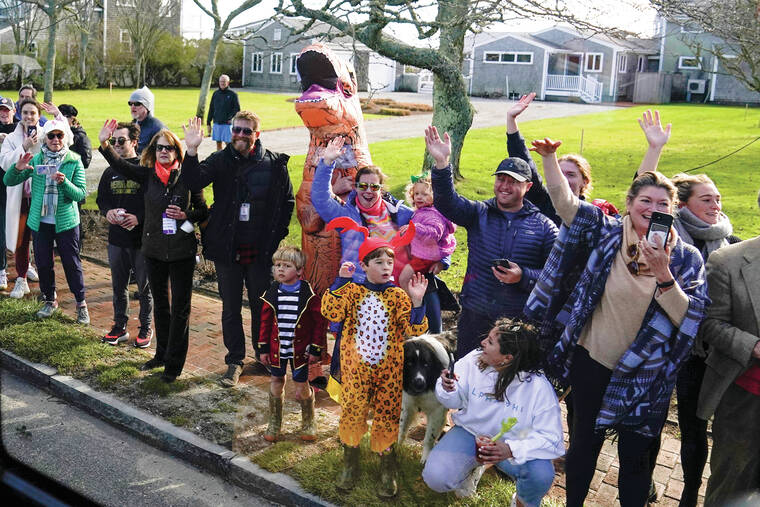 People cheer President Joe Biden's passing motorcade Thursday as he and first lady Jill Biden drive to the United States Coast Guard Station Brant Point in Nantucket, Mass. (AP Photo/Carolyn Kaster)