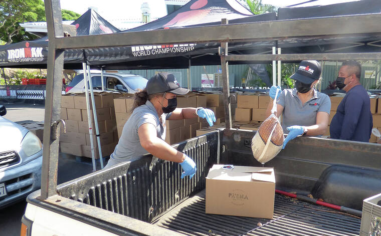 Volunteers with the Ironman Foundation loaded 600 boxes and turkeys into vehicles to ensure hungry members of the Big Island community enjoy a nice meal. Each grocery bundle featured a 12- to 14-pound turkey, loaf of Punaluu sweet bread, Portuguese sausage, onions, tomatoes, sweet potatoes and a recipe.