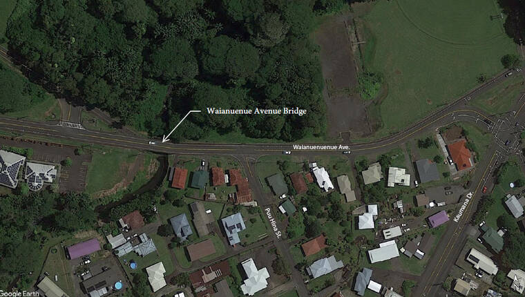 Hawaii Department of Transporation photo The overhead photo shows the location of the Waianuenue Avenue Bridge. At right is the intersection of Waianuenue Avenue and Kaumana Drive.