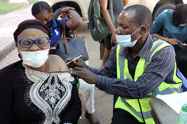 FILE - A woman receives a coronavirus vaccine in Abuja, Nigeria, Monday, Nov 29, 2021. A pandemic-weary world faces weeks of confusing uncertainty as countries restrict travel and take other steps to halt the newest potentially risky coronavirus mutant before anyone knows just how dangerous omicron really is. (AP Photo/Gbemiga Olamikan, File)