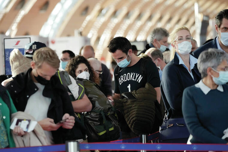 Passengers wait to board a plane for New York on Nov. 8 at the Charles de Gaulle airport, north of Paris. (AP Photo/Christophe Ena, File)
