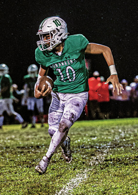 “The kid’s been tough as nails all year; he’s been our horse,” Uemoto said of Kaiawe. “He closed it out for us tonight. Although he didn’t have the yards or the running lanes he usually sees, he made the biggest run of the year for sure.”