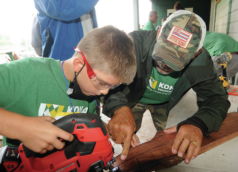 Volunteer Aaron Nakashima helps “Ezra” use a jigsaw Saturday at Kona Vocational. (Laura Ruminski/West Hawaii Today)