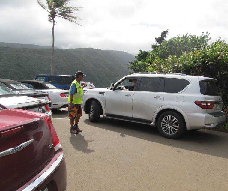 Paul Ishikuro directs traffic at the crowded Pololu Valley overlook Friday. (Nancy Cook Lauer/WEST HAWAII TODAY)
