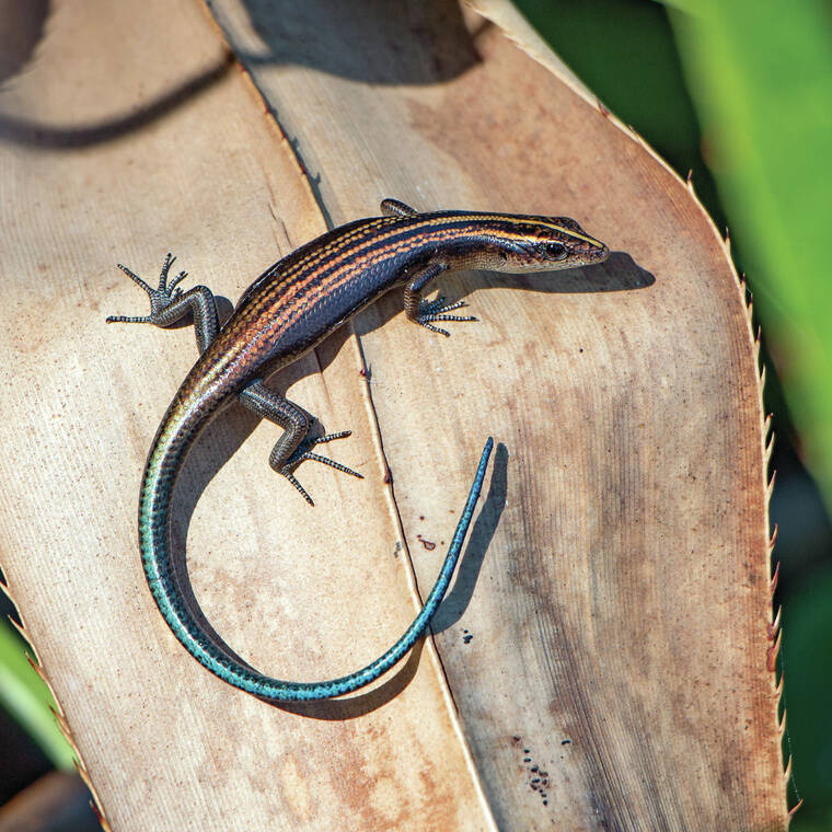 “I first became aware of this lizard on Hawaii Island in 2017 when Aaron Mickelson, a former student in UH-Hilo’s Tropical Conservation Biology and Environmental Science graduate program, sent me a photograph taken by Gary Miller and asked me if I knew what this lizard was,” Mautz explains. “I said I know what it is, but it is not supposed to be here anymore. The little brown skinks common in Hilo backyards are a different species called the delicate skink. They may have a slate-colored tail but it is not a true blue. The azure-tailed skink also has a stripe over the top of its head.”