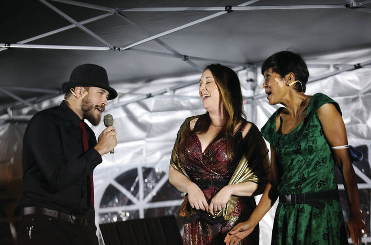 Kelsey Walling/Tribune-Herald From left, Matt Bash, Samantha Shea and Joanne Pocsidio perform "Jingle Bells" together while rehearsing Wednesday for the Hilo Community Players' Christmas Cabaret on the outdoor stage at Afook-Chinen Civic Auditorium.