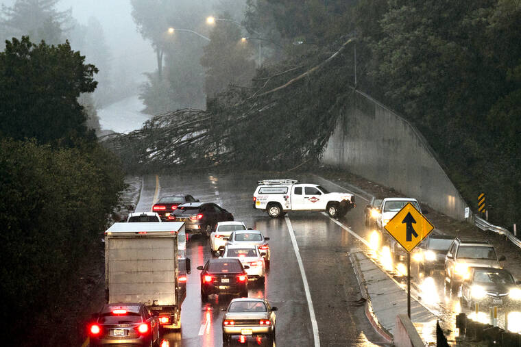 LOS ANGELES — Two people died in a submerged car, evacuations were ordered for wildfire-scarred California, and Seattle and Portland faced the rare chance of snowy streets as a wave of storms rolled through the West.
