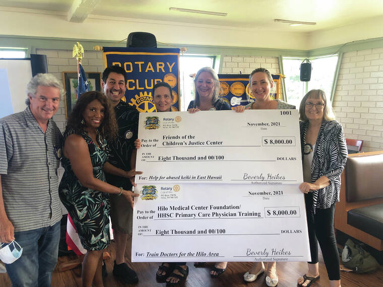 The Rotary Club of Hilo presented two checks of $8,000 each to their annual signature beneficiaries at the Nov. 19 club meeting.
