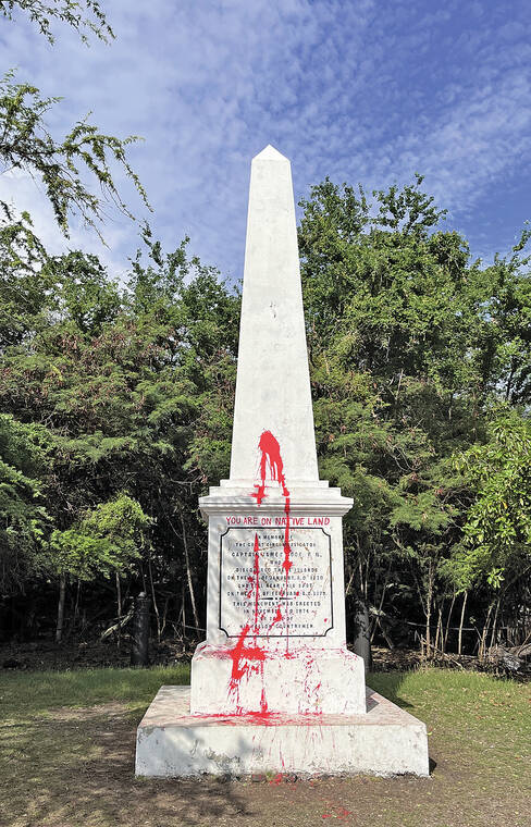 The white obelisk at Kaawaloa, which commemorates Capt. James Cook, the British explorer and navigator who was killed at the site on Feb. 14, 1779, was defaced with red paint along with the words “you are on native land.” The vandalism to the 27-foot monument erected in 1874 by Cook’s “fellow countrymen” showed up Saturday morning.